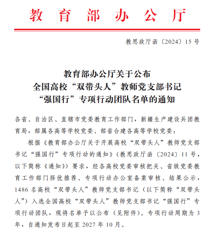我院党支部入选全国高校“双带头人”教师党支部书记“强国行”专项行动团队名单