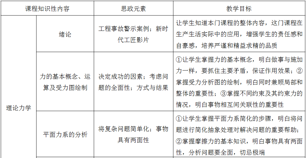 像《工程力学》这样的传统基础理论课程很多,这些课程的共同特点就是课程概念理论多,抽象晦涩难懂,趣味性不足。如何将课程思政融入课程内容需要从最初的课程设计着手。从课程属性上来讲,《工程力学》属于专业基础课,旨在培养学生的工程师思维。因此,可从这方面找到突破口,加入思政元素。作为一名合格的工程师要具有在工作中追求精益求精的态度与品质,更要有敬业、精益、专注、创新等方面的素质,即通常所说的“工匠精神”。同时,作为一名工程师要坚守自己的职业道德,坚决杜绝工程中的偷工减料行为,保障人民的生命和财产安全。基于此,对《工程力学》课程进行了如下所示的课程设计(以部分内容为例)。