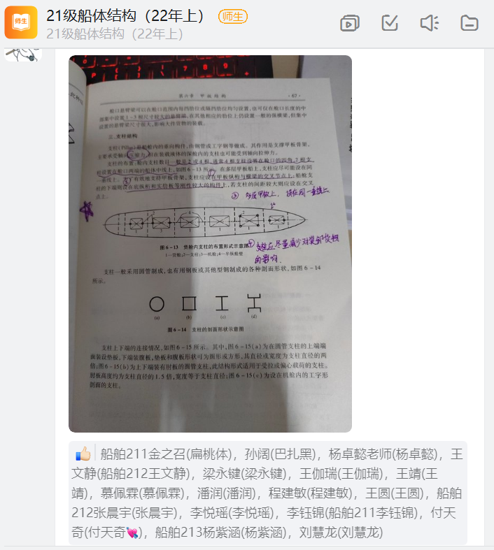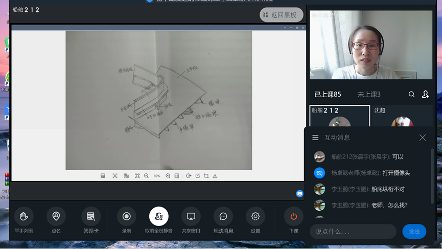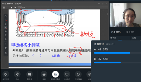 直播课的一大优势在于,教师可以将授课内容共享到每个学生的手机端,非常利于强调课程的重难点。船体结构课程,学生们对繁杂的船底构件及其焊接方式理解记忆困难,在备课阶段准备了手绘板,在直播课上进行结构图片中的构件标识,帮学生在线上完成船体结构的认知。