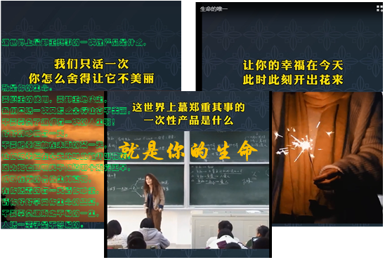 作为教师的我们不仅需要给学生们传授知识,更重要的是教会学生们爱国家、爱人民、爱自己,即要学会大爱也要学会小爱,只有这样我们的社会才能是和谐的、文明的、进步的。让同学们从枯燥乏味的学习中学习怎样寻找学习的乐趣,怎样找到能让自己发挥自己特长的方法和方式,以此激发学生的创新思维,想象和发散思维的思考能力,树立坚定的信心,学习培养坚定的毅力,相信这对于一个人来说圆满的走完一生更重要。在课程当中,不断地让学生意识到时间和生命的宝贵,不要虚度年华,要好好享受你生命的盛宴,不要辜负了这仅有一次的人生!