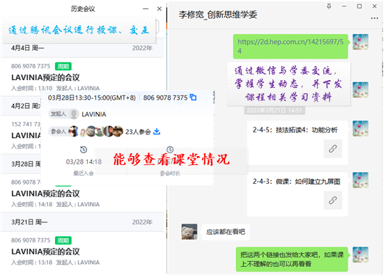 在这样一个艰难的、全国上下万众一心抗疫的关键时期,我们每一个人都是战士,做着自己应尽的事情,让同学们一定要坚持学习、坚持锻炼,在学校里做好自己应该做的每一件事,不给学校增加负担就是给国家减负。如图2所示,这是疫情期间开展线上教学的部分展示,学生们没有缺课迟到的现象,而且学委也非常积极的和授课老师沟通,从3月初疫情开始到现在已经顺利的完成了五周的授课任务。在这期间虽然学生和老师们都是辗转于各大线上授课平台,克服在线授课的中种种困难,相信在大家的齐心协力下,一定能取得抗击疫情的胜利!