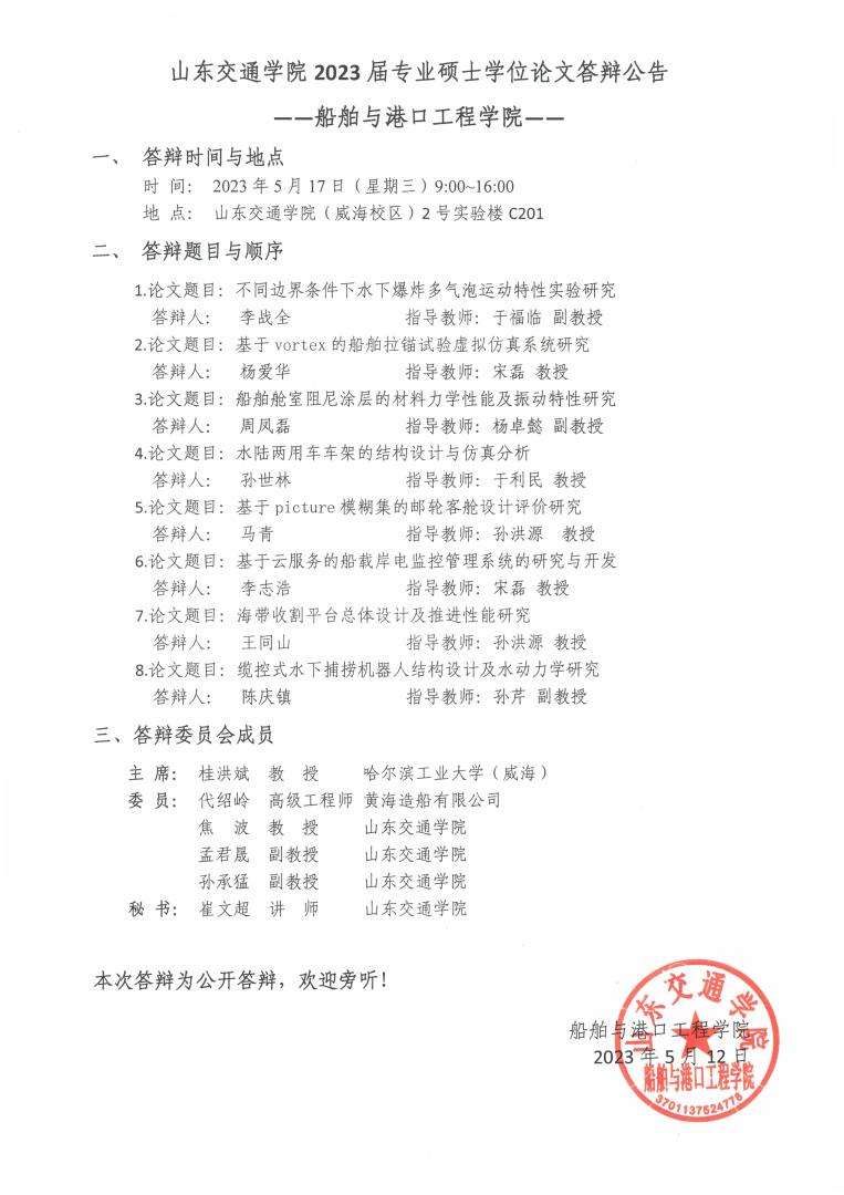2007so太阳集团2023届专业硕士学位论文答辩公告