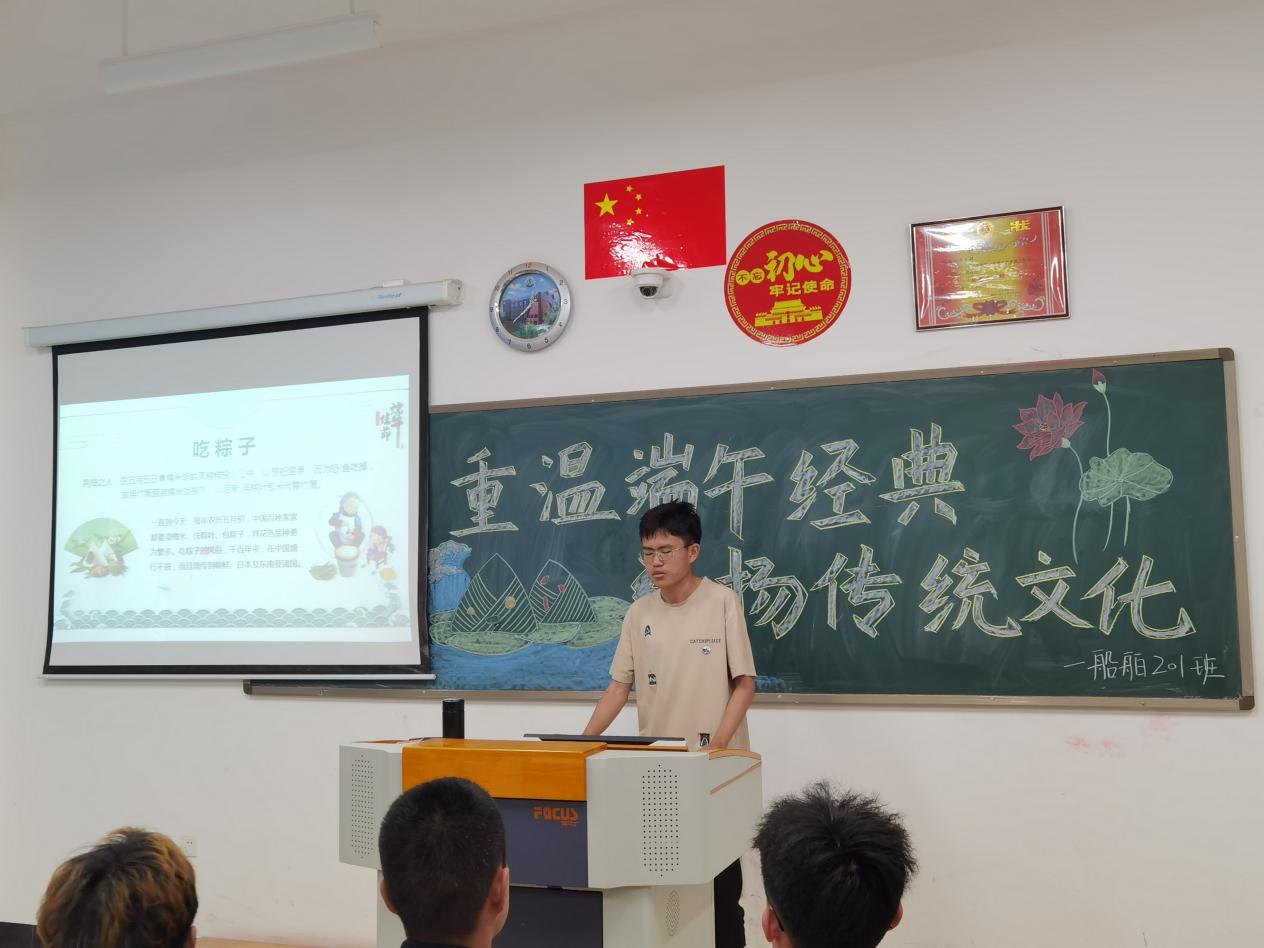 活动伊始,各班主讲人引领同学们重温端午节的起源,了解端午节不同地区的传统习俗。此后,同学们诵读伟大爱国诗人屈原代表著作《离骚》,讲述有关屈原的故事,了解屈原的光辉事迹,感受与学习屈原的爱国精神、献身精神,感受屈原著作中蕴含的浓厚家国情怀。
