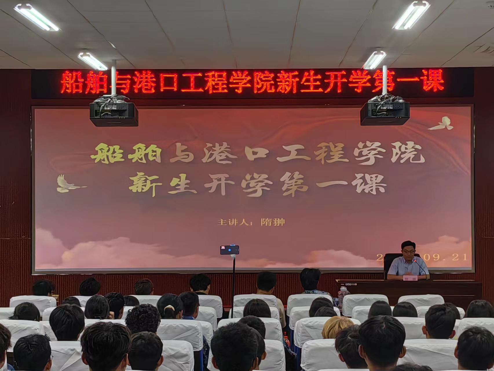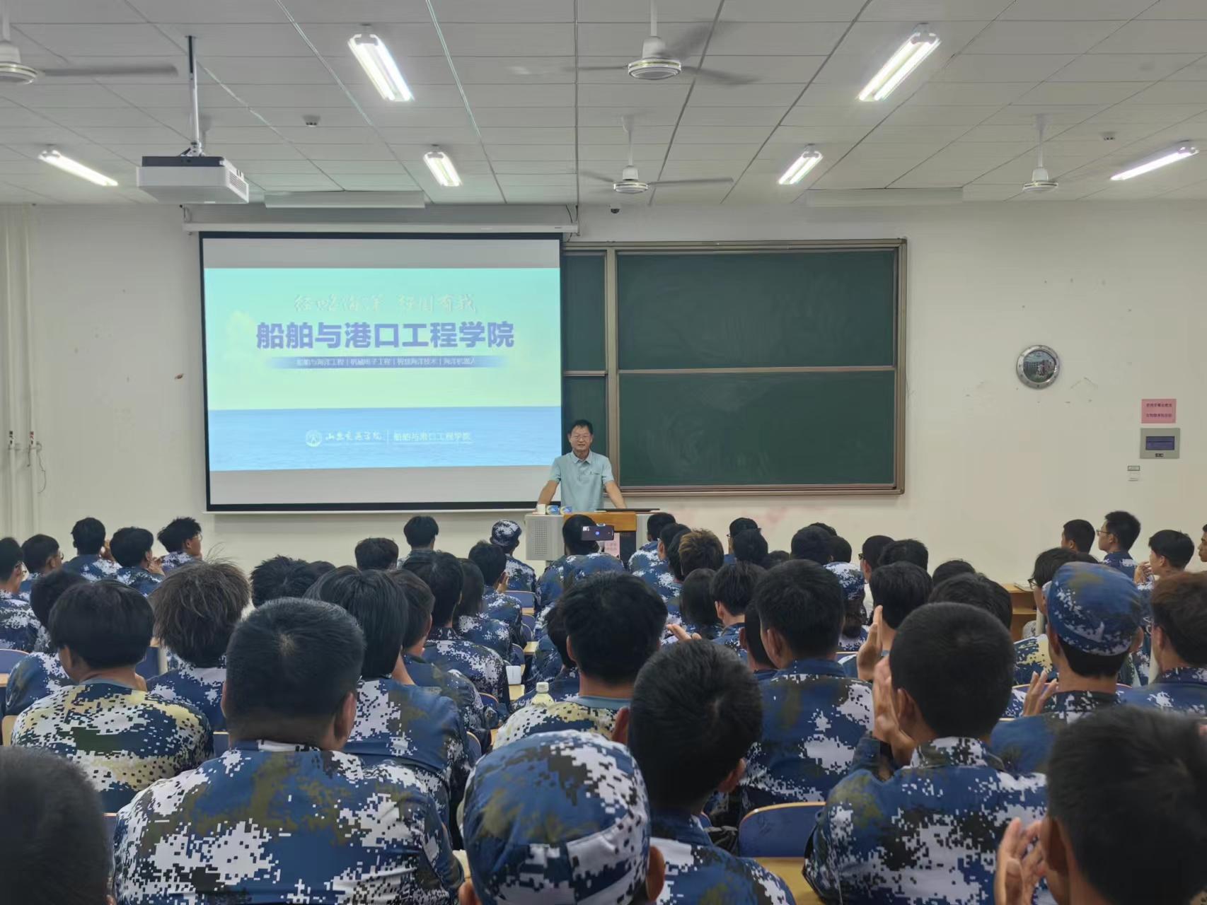 学院院长李光正在威海校区第二教学楼C107教室以“经略海洋,强国有我”为主题,为2023级新生讲述了学院的发展、专业的建设、大学生身份的认知及个人的理想与目标,他勉励同学们要以饱满的热情和坚定的信心迎接新的挑战,珍惜学习机会,提升综合素质,成为具有爱国主义精神、国际化视野,富有创新意识和实干精神的交通事业高级应用型专门人才。