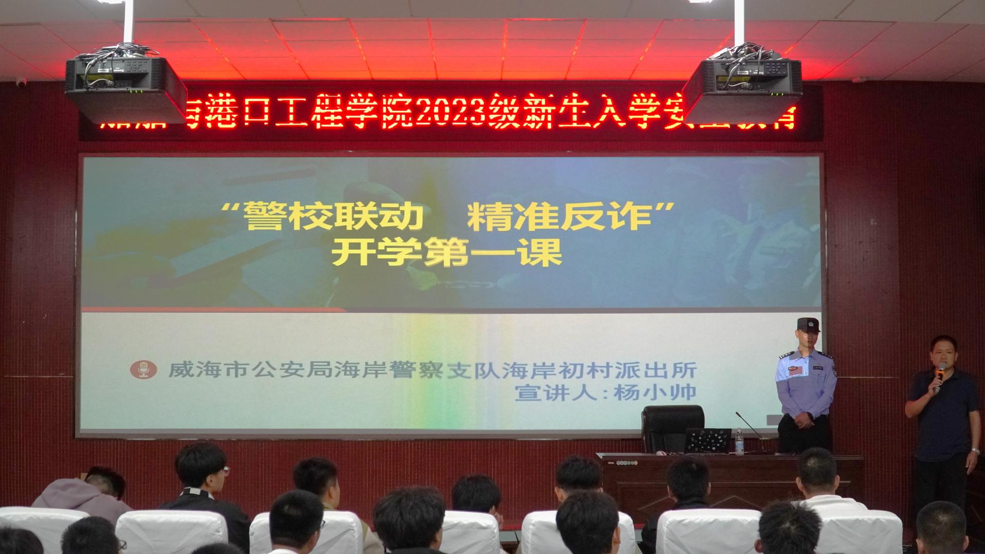学院党委副书记宋新刚在威海校区第二报告厅以“文明守纪,逐梦远航”为主题,带领2023级新生了解了学院的校规校纪、日常学习、安全管理等多个方面的内容,他要求同学们要遵纪守法,养成良好的生活作息习惯,强化自立自强意识,树立诚信观念,提升人际交往能力,培养良好的道德素质,展现当代大学生的精神风貌。讲座当天还邀请了威海市海岸警察支队初村派出所杨小帅警官为新生开展防诈骗专题讲座。