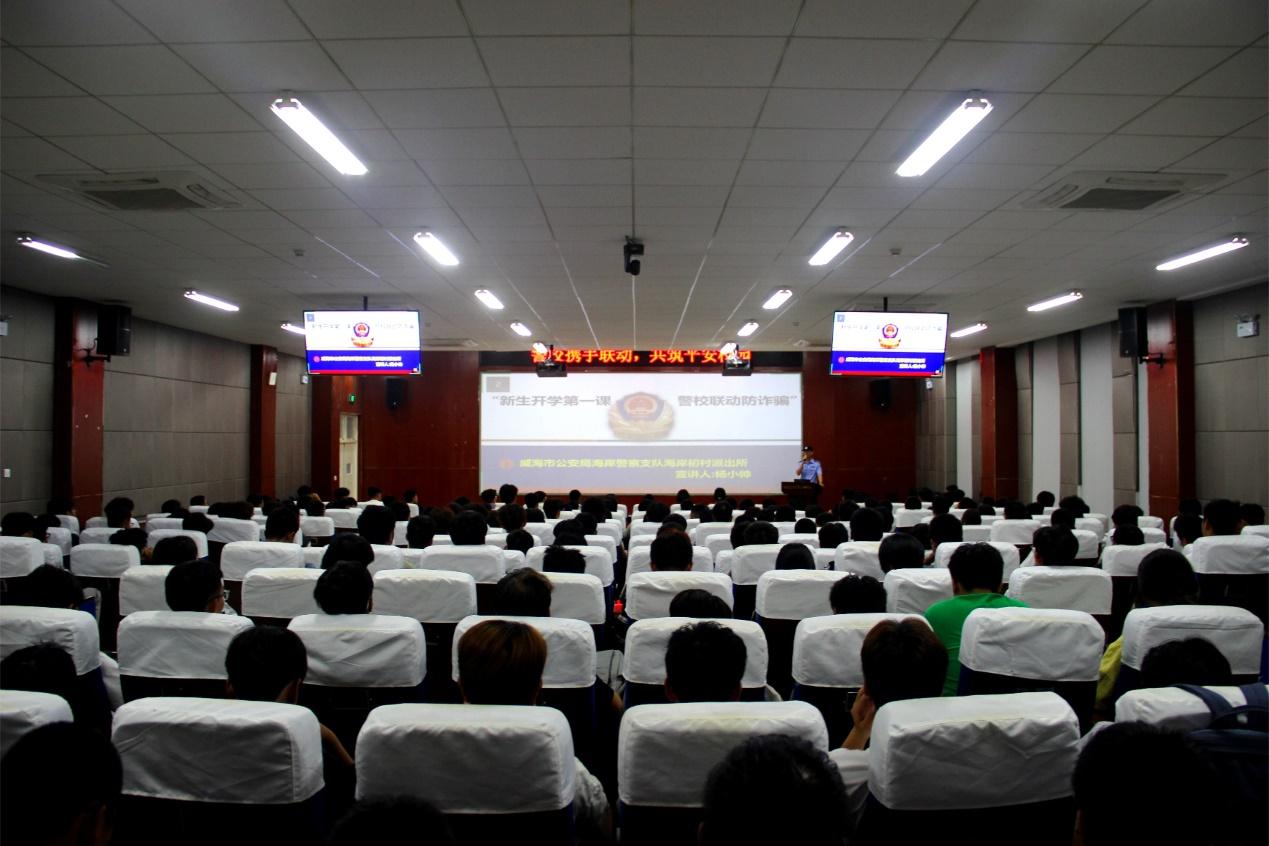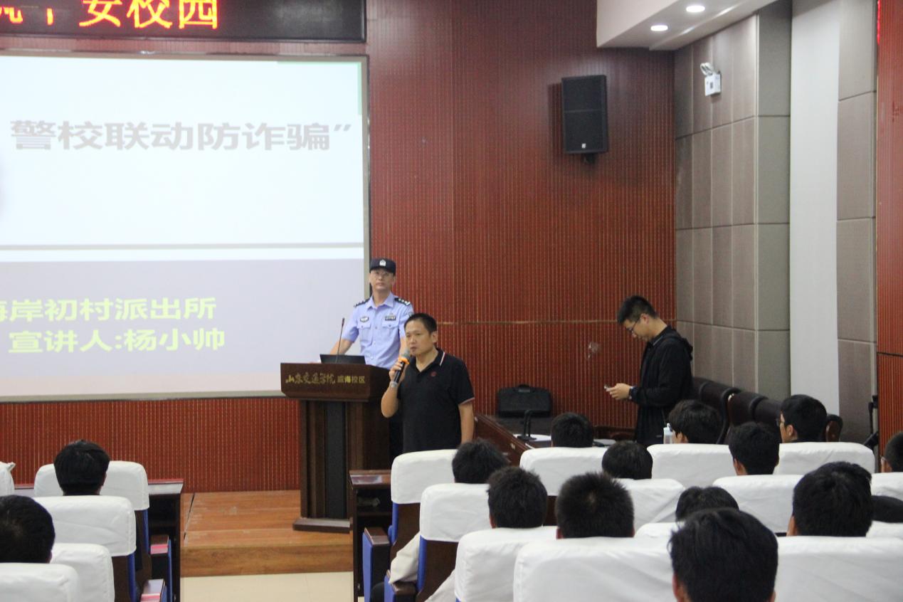 9月23日晚,学院在二号教学楼C101报告厅举办2024“海韵讲坛”第五讲——“警校联动 预防诈骗”安全教育专题讲座,威海市环翠区初村派出所杨小帅担任主讲嘉宾,学院党委副书记宋新刚主持,全体辅导员和2024级全体学生参加。