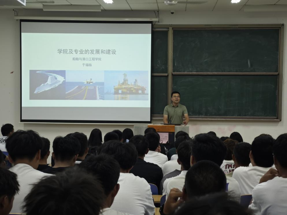 船舶与海洋工程专业教研室主任于福临老师围绕船舶与海洋工程专业的发展历程、课程体系、就业去向进行介绍,对学院的师资力量、人才培养、科研团队及研究方向进行阐释。鼓励同学们认真学习专业知识,提升综合素质,成为富有创新意识,具有爱国主义精神和实干精神的交通事业高级应用型专门人才。