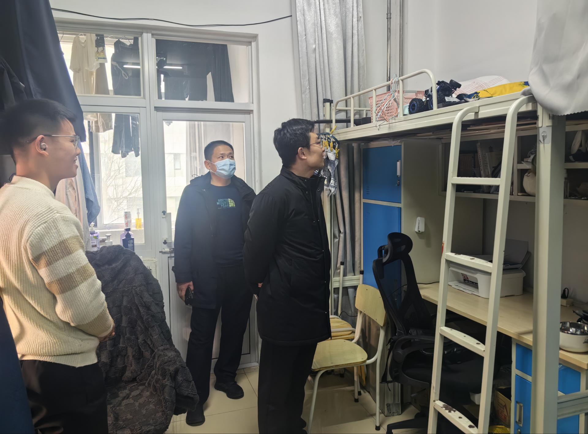 检查过程中,隋翀仔细检查了学生宿舍用电、用水、暖气等情况,与同学们交流期末复习进展。他要求同学们守牢安全底线,注意用电安全,合理安排课余时间,抓住期末复习的关键节点,以良好的精神面貌迎接学期末的学习和生活。