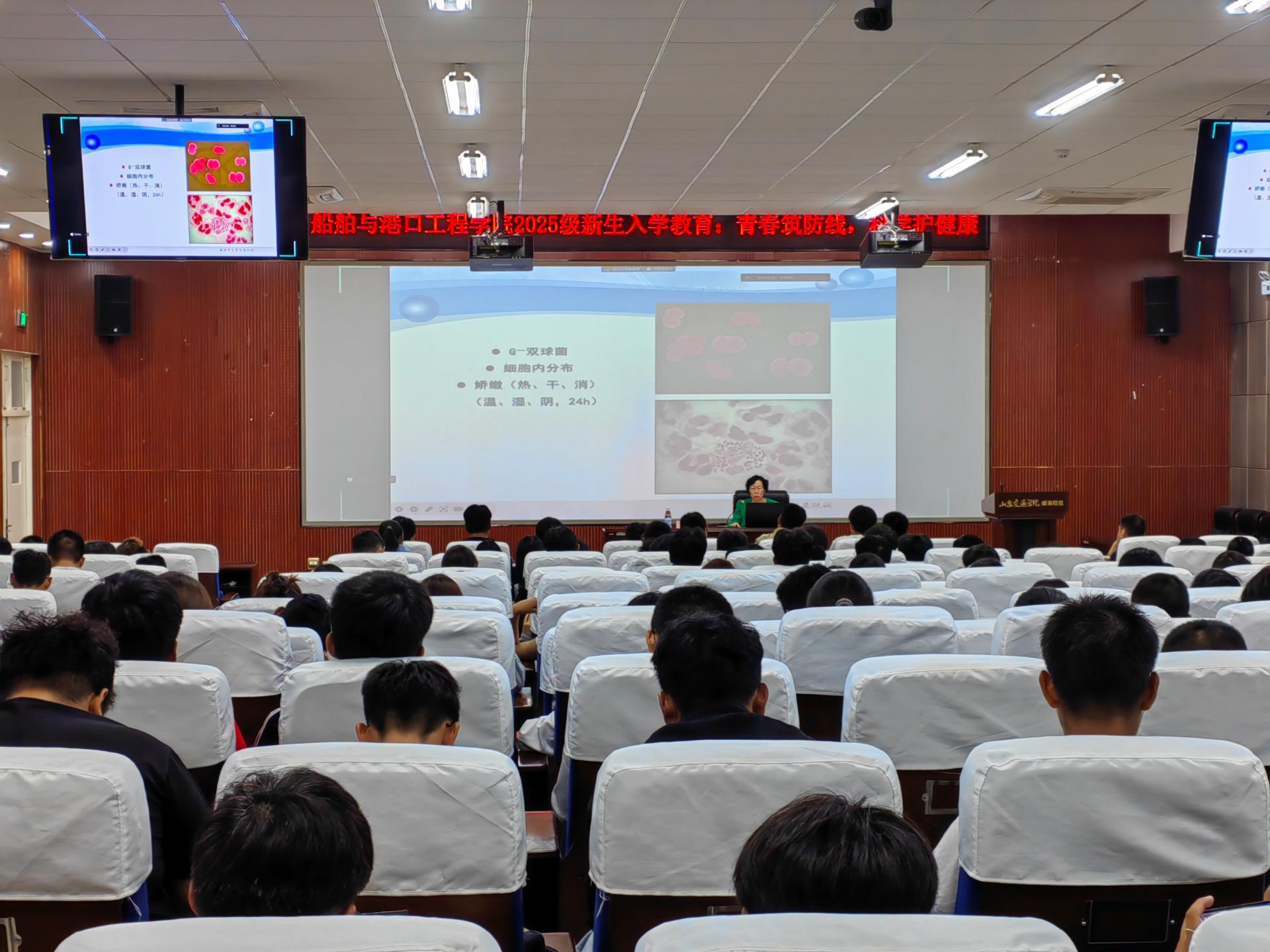 9月24日晚,学院在2号教学楼C101报告厅开展“青春筑防线,科学护健康”入学教育专题讲座,威海市立医院张锐利主任担任主讲嘉宾,学院党委副书记宋新刚主持,辅导员及2025级全体新生参加活动。