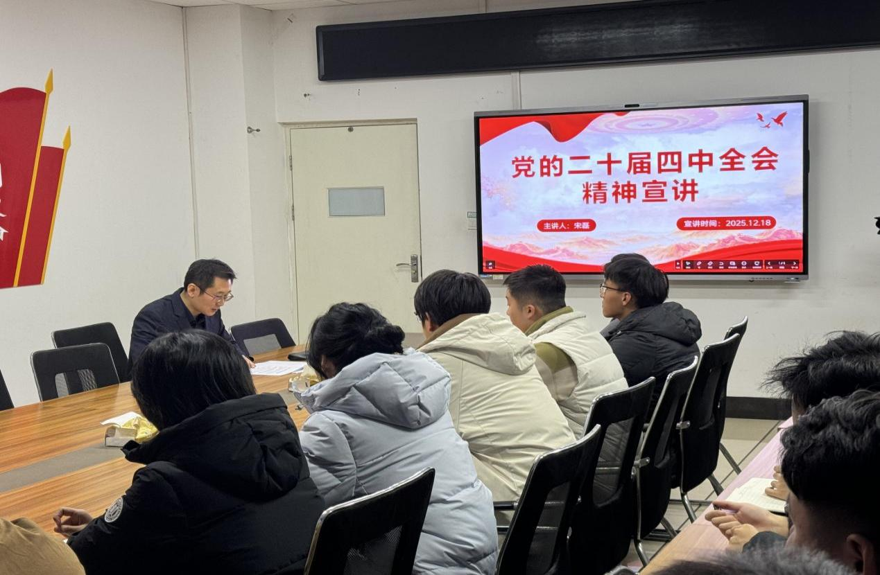12月18日,学院副院长、省级“双带头人”教师党支部书记工作室负责人宋磊在二号教学楼D407党员活动室开展党的二十届四中全会精神宣讲会。学院学生党支部党员、入党积极分子、共青团员代表参加本次学习。