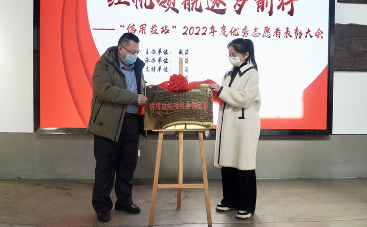 丛景妤与张军共同为“信用益站项目合作团队”揭牌。