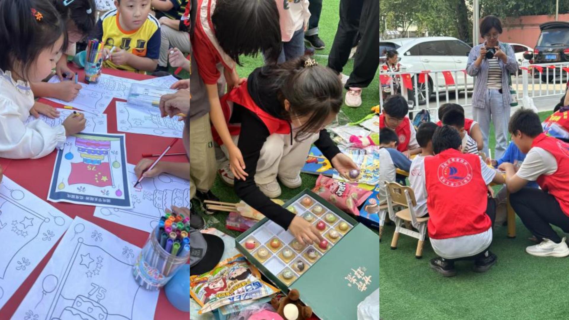 律动表演结束后,老师和志愿者指导孩子们在绘画纸上绘制出自己心中国庆的样子,给孩子们心目中种上一个爱国的种子。同时,由23名亲子家庭组成的爱心摊位,摆满了各种玩具、书本、手工制作的发夹等,“小摊主们”积极介绍义卖商品。