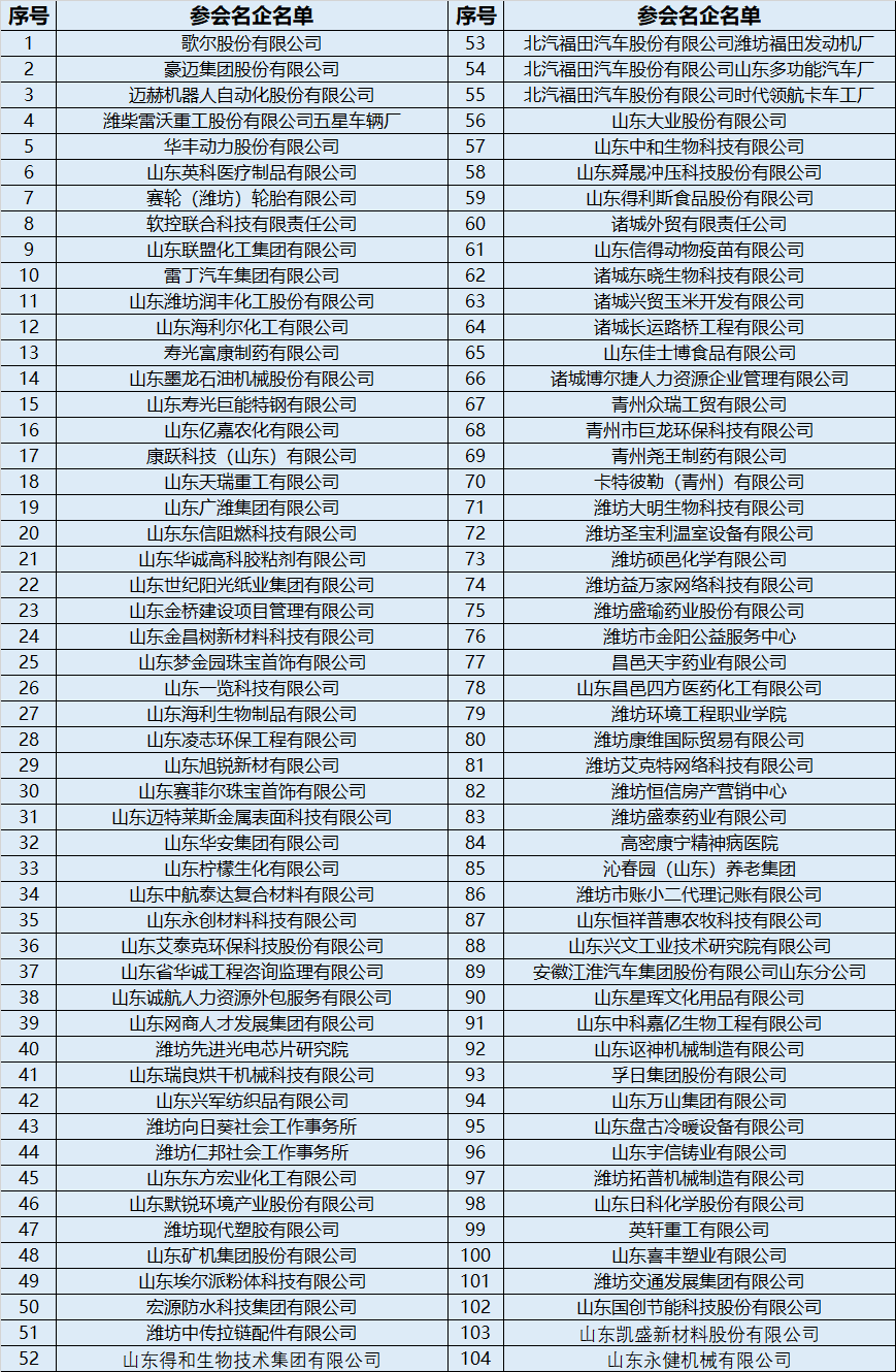 2、名企联合。已定向邀请歌尔股份、豪迈集团、北汽福田、雷沃重工、迈赫机器人等百余家潍坊名企联合参加。