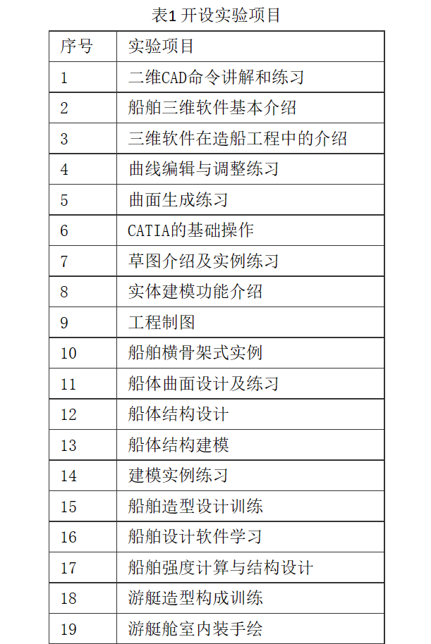 承担本学院所有专业的实验上机课程,包括《机械制图CAD》、《计算机绘图》、《高级语言编程》、《计算机辅助船舶设计》、《船舶总体设计》、《船舶生产设计》、《游艇造型设计》、《流体力学》、《有限元分析》等专业课程的教学实验。开设实验如表1所示。