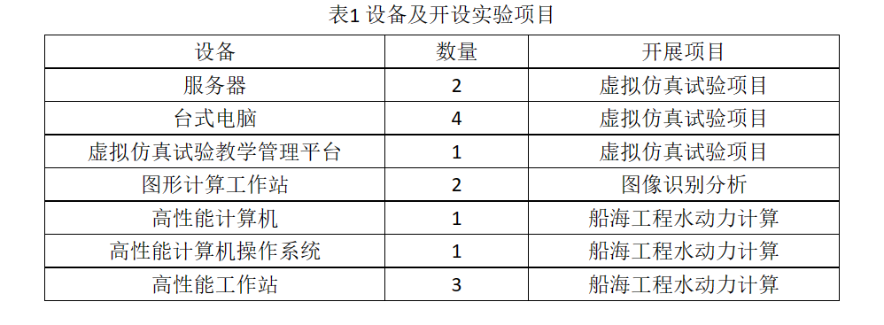 承担《流体力学》、《计算流体力学》、《海洋航行器流体力学》、《船舶阻力与推进》等专业课程的仿真与模拟分析。设备及开设项目如表1所示。