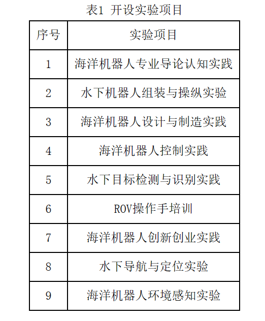 承担《海洋机器人专业导论》、《海洋机器人认知实践》、《海洋机器人设计与制造实践》、《海洋机器人控制实践》、《水下目标检测与识别实践》等专业课程的教学实验。开设实验如表1所示。