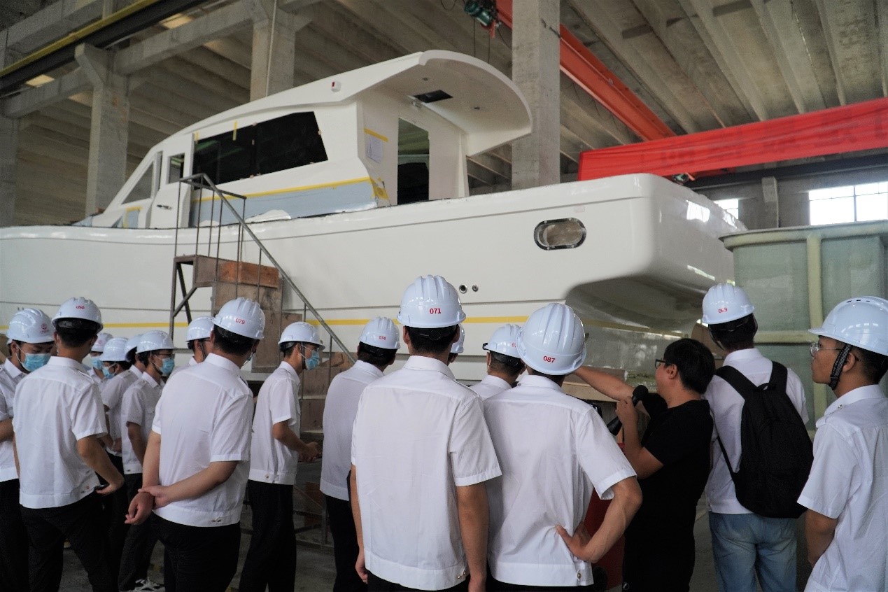 在游艇制造企业,同学们了解了玻璃钢游艇的建造过程,掌握了游艇制造模具的种类及重要性,认识了胶衣、玻璃纤维布和树脂等游艇制造原材料,体验了游艇企业的工作环境。