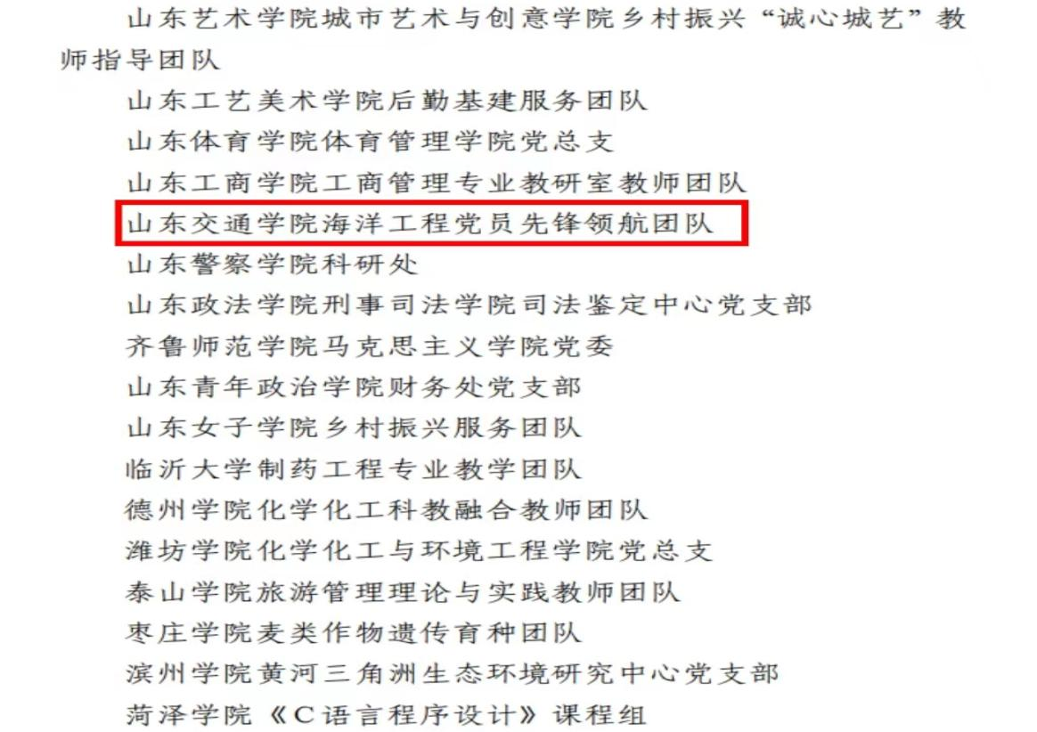 近日,中共山东省委教育工委印发了《关于命名山东省教育系统共产党员先锋岗和党务工作先锋的通知》,我院海洋工程党员先锋领航团队获得“山东省教育系统共产党员先锋岗”称号。