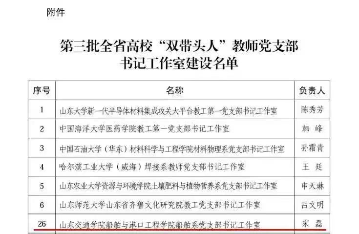 近日,山东省委教育工委公布了第三批全省高校“双带头人”教师党支部书记工作室建设名单,我院船舶系党支部书记工作室成功入选。