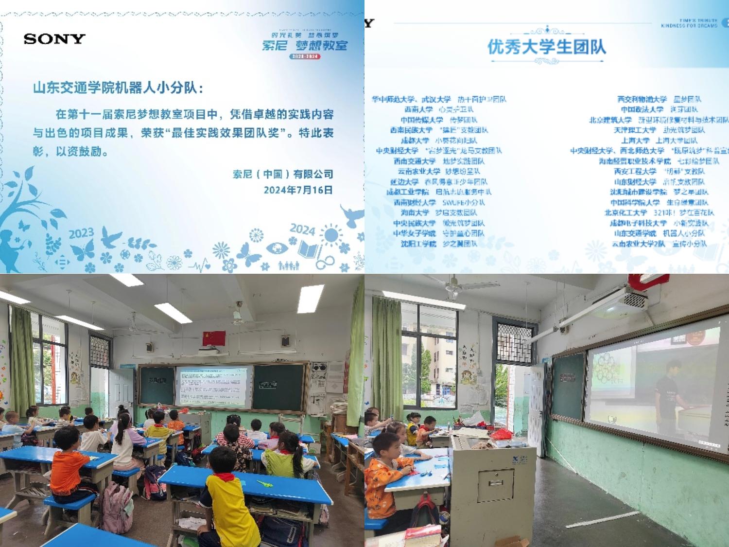 2024年7月16日,第十一届“索尼 梦想教室”圆满收官,92所高校的262支大学生志愿团队成为筑梦者,支教时长累计10,007日,梦想课堂累计达 42,005 课时,3,720名大学生、74,491名中小学生直接参与其中。我院23级海洋机器人专业艾亮带领的“机器人小分队”成功获批实践立项并获得“最佳实践效果团队”。