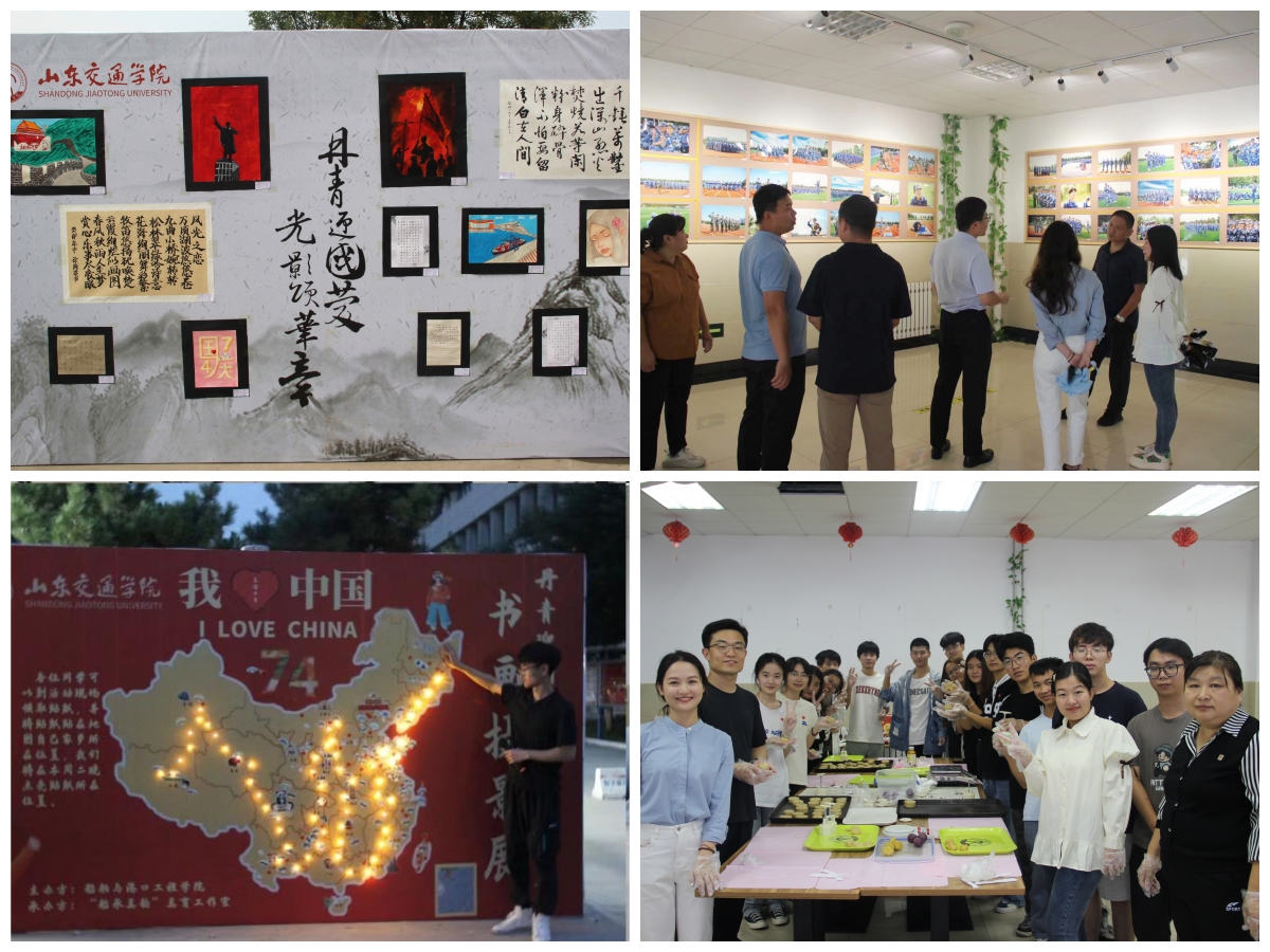 “丹青迎国庆,光影颂华章”书画摄影展包含诗词翰墨、彩绘丹青、青春摄影三个主题,共展出作品60余幅,吸引了众多师生驻足观赏;“国家·点亮”活动中,师生将贴纸贴到中国地图展板对应的家乡位置,来自五湖四海的交院学子相聚于此,共同送上对祖国母亲最真挚的生日祝福,并于27日晚6时,进行了“点亮家乡”仪式;“情满中秋节,月是故乡明”月饼设计制作活动中,师生齐聚餐厅将印有自己设计纹样的月饼制作出来,松软清香的外皮与香甜软糯的内馅相得益彰,把团圆之味传递给每一位师生。