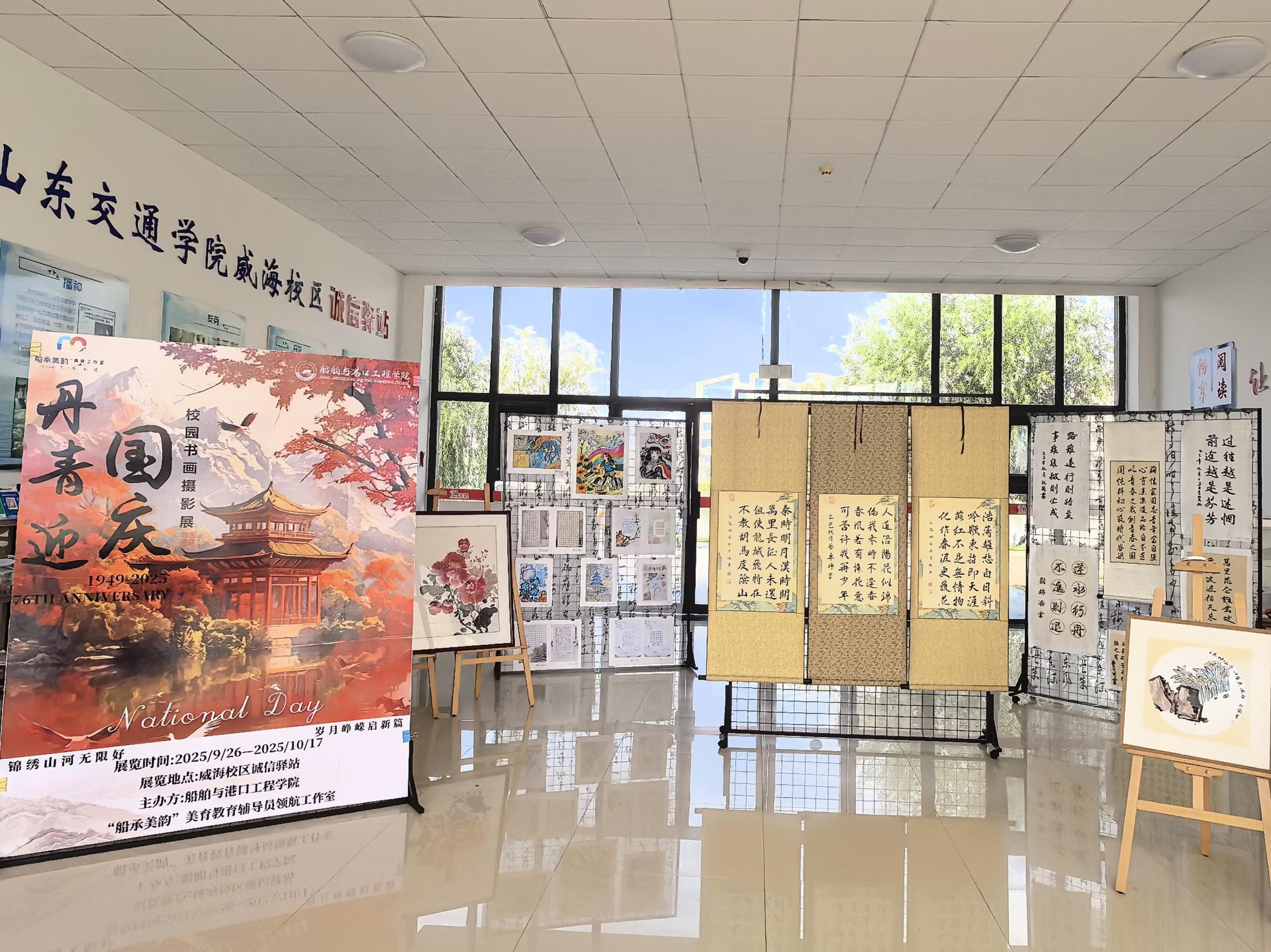 为迎接中华人民共和国成立76周年,厚植学生爱国主义情怀。近日,学院在威海校区举办“丹青迎国庆”校园书画展。